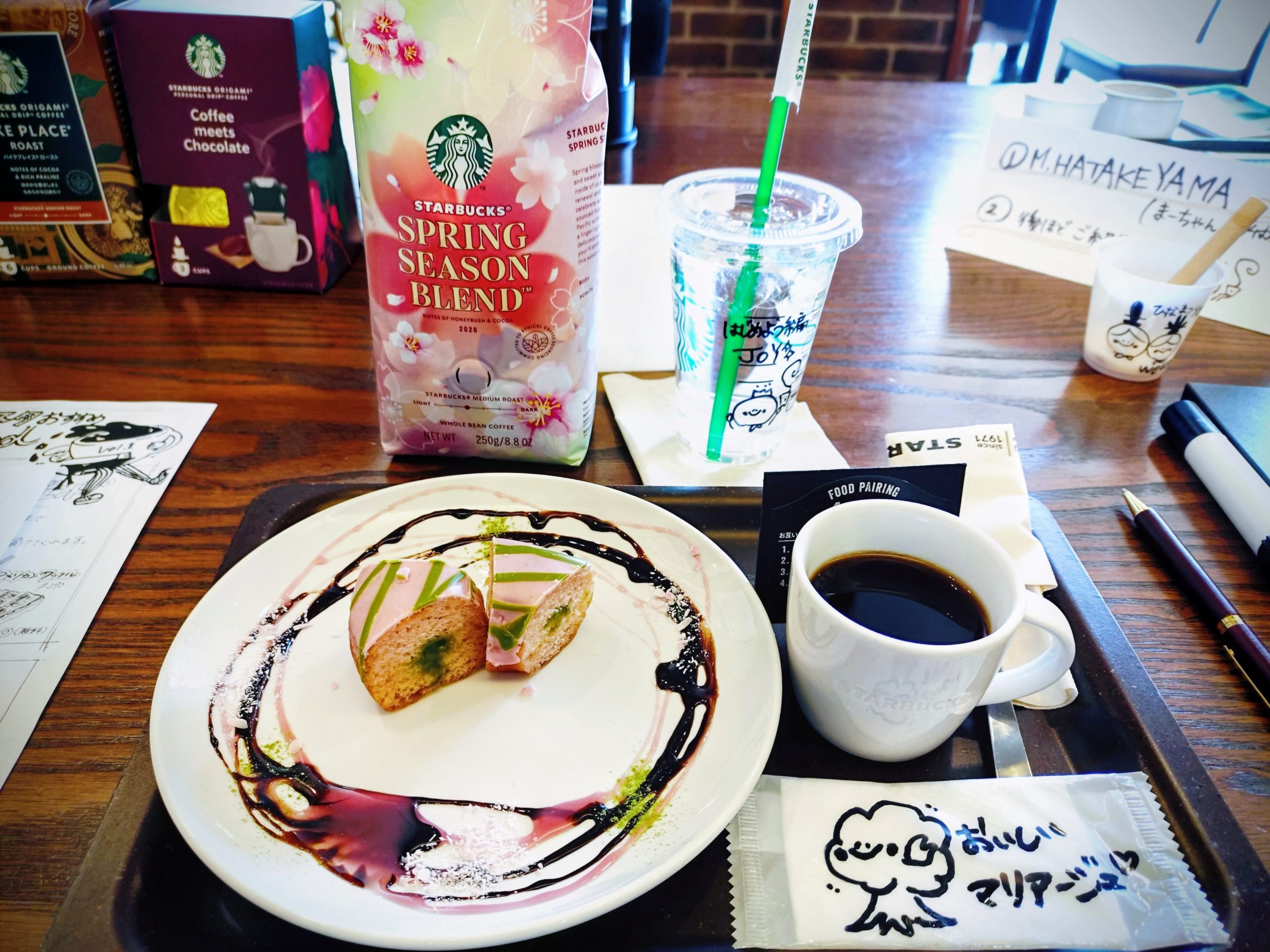 ウェルカムドリンクは発売前日の”桜咲くよ、白桃フラペチーノ”で小さなカップにバリスタが、おひなさまのイラストを手書きで描いてくれたようだ(なかなかの画伯である)